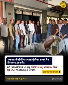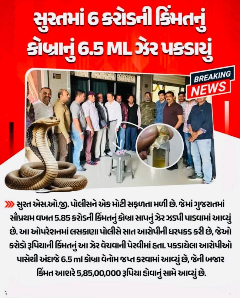 ગુજરાતના ઇતિહાસમાં આ પહેલી વાર આટલી મોટી માત્રામાં કોબ્રા સાપનું ઝેર પકડાયું છે. સુરત શહેરમાં સ્પેશિયલ ઓપરેશન ગ્રુપ (SOG) દ્વારા આ કાર્યવાહી હાથ ધરવામાં આવી હતી, અને અંદાજે ₹5.85 કરોડની કિંમતનું ઝેર જપ્ત કરવામાં આવ્યું હતું અને 7 લોકોની ધરપકડ પણ કરવામાં આવી હતી. કરોડો રૂપિયાની ઓફર કરીને સોદો નક્કી કરવામાં આવ્યો.